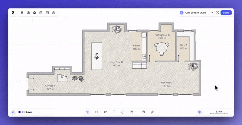 Unlike other event venues we've used in the past, the Silent Gliss showroom is a bit of a blank canvas. To better understand how we can utilize the space, we used Rayon, a web-based space design tool, to map the space. We could set the scale and measure the room by uploading a PDF floor plan provided by the Gliss studio.